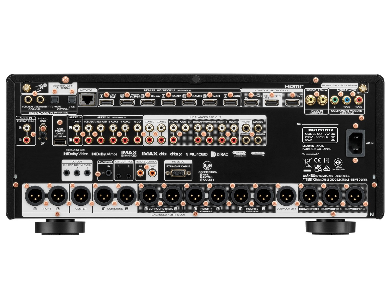 Ο Marantz AV-30 ειναι προενισχυτής AV home cinema 11.4 καναλιων. Υποστηριζει Dolby Atmos, DTS:X Pro, Auro-3D, IMAX Enhanced, 8K Ultra HD, Dirac, Audyssey. Διαθετει HEOS Built-In streaming.