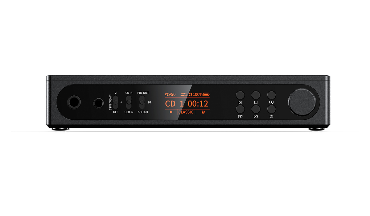 Designed with usability in mind, the FiiO DM15 R2R includes a retro-style orange TFT display, mechanical controls, infrared remote, 24 global sound presets, selectable BASS modes and ESP anti-skip protection. Outputs include 3.5 mm headphone, 4.4 mm balanced headphone, 3.5 mm LO and digital coaxial/optical outputs. Whether used as a portable transport, a desktop CD source, a Bluetooth CD streamer or a USB DAC, the FiiO DM15 R2R stands apart as the most versatile portable CD player in its class.