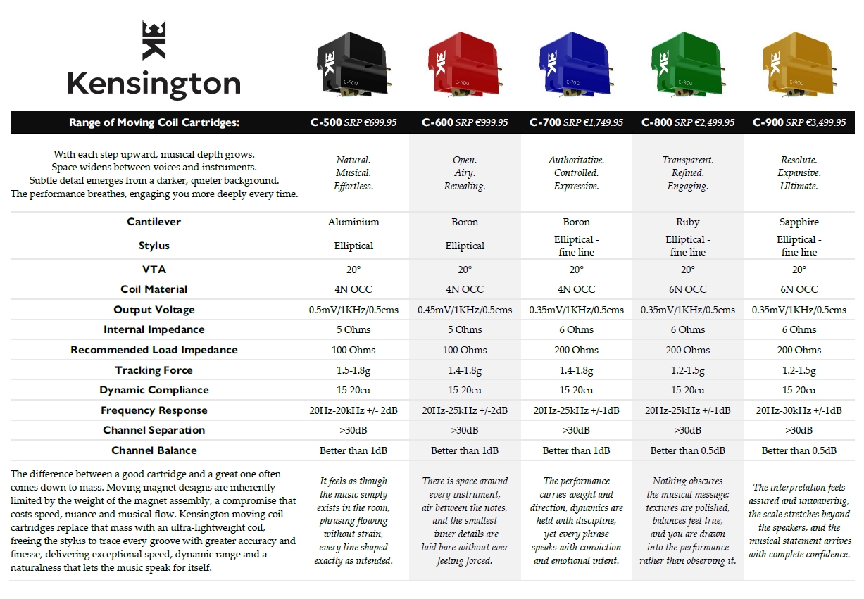 Η Kensington Audio C-800 ειναι κεφαλη MC (κινητου πηνιου) χαμηλης εξοδου (0.35mV) με ruby cantilever και coils με χαλκο 6Ν. Η βελονα ειναι ελλειπτικη fine line.