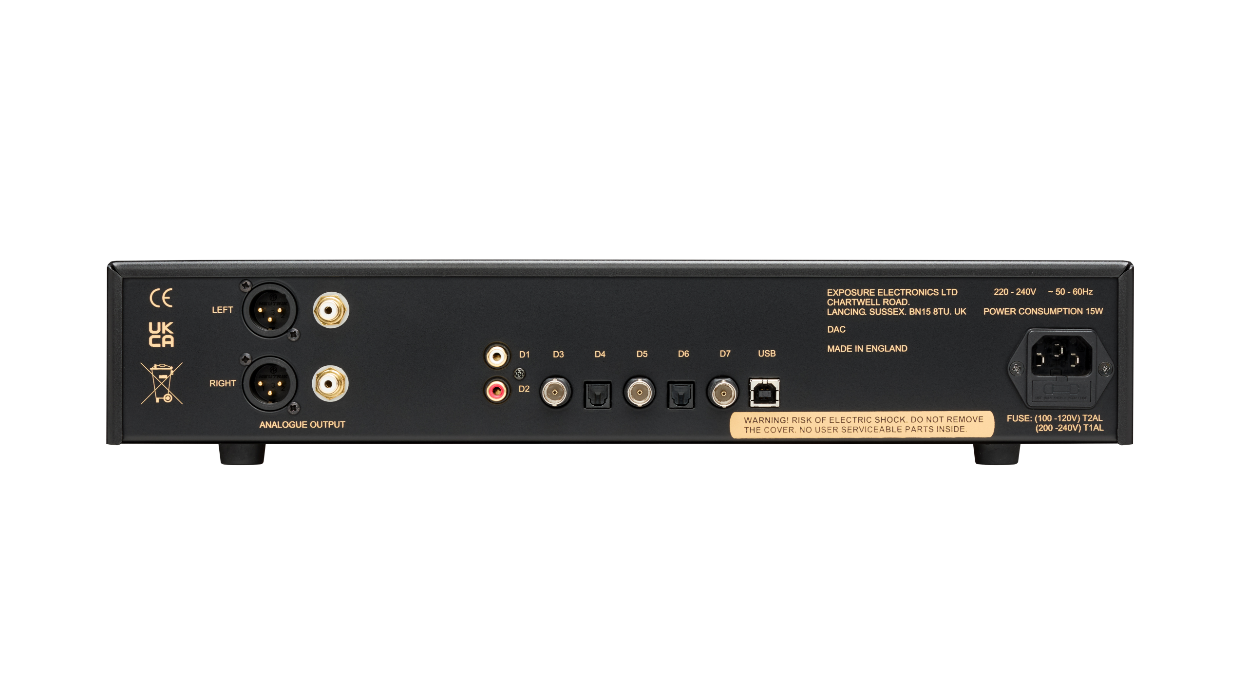 Το Exposure DAC, ειναι ψηφιοαναλογικος μετατροπεας και προενισχυτης, για αρχεια PCM via SPDIF (32kHz to 192kHz), PCM via USB (32bit 44.1kHz – 768kHz) και DSD via USB (x64 – x256). Εισοδοι: 2x Coaxial RCA, 3x Coaxial BNC, 2x Optical, 1x USB-B. Εξοδοι: 1x pair RCA και 1x pair XLR. Made in England.