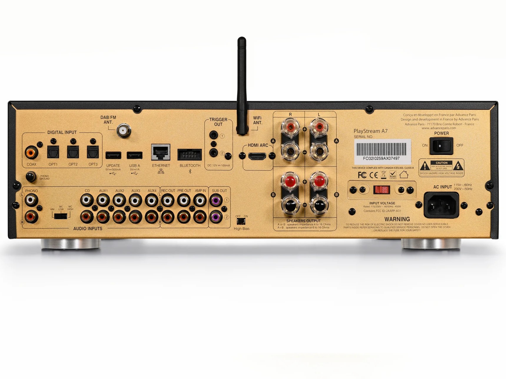 Ο Advance Paris PlayStream A7 ειναι δικαναλος ραδιοενισχυτης 2x 115 watts. Διαθετει FM, DAB, WiFi, Network Player (Spotify, Deezer, Qobuz, Tidal, TuneIn, iHeartRadio, vTuner, Napster), HDMI ARC, USB DAC (εισοδοι 1x coaxial, 3x optical, 1x Ethernet), εισοδο για δεκτη Bluetooth (extra). Διαθετει phono MM/MC, εξοδους Pre Out και Sub Out.