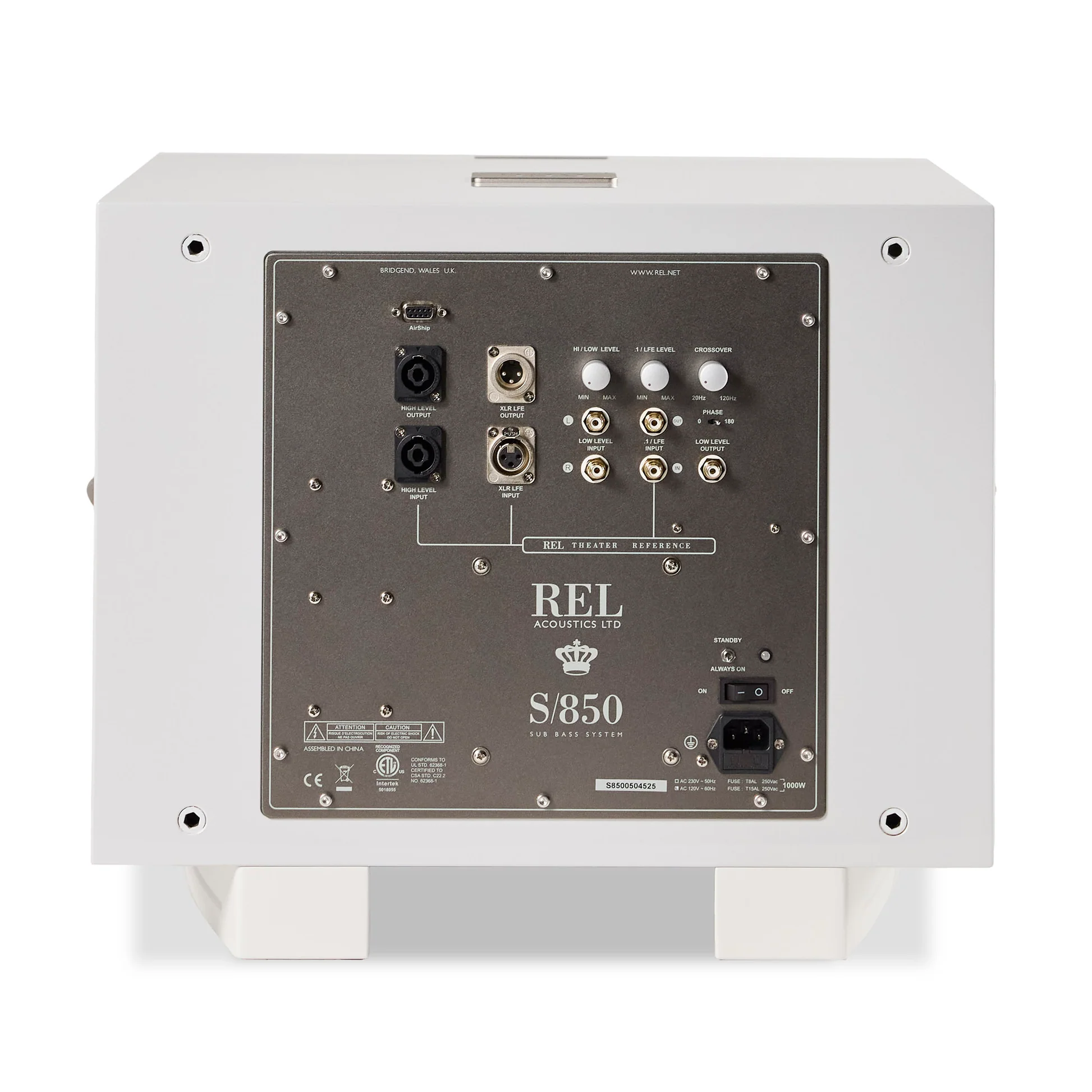 Το REL S/850 ειναι ενεργο υπογουφερ με 1x 12" woofer και 1x 12" passive radiator, με ενσωματωμενο ενισχυτη 850wrms Linear Class D. Δυναται να συνδεθει ασυρματα μεσω REL Air System transmitter.