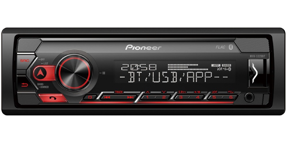 The Pioneer MVH-S320BT is a 1-DIN mechless media receiver with built-in Bluetooth®, red key illumination and a front USB input, designed to work seamlessly with Android smartphones. It supports the Pioneer Smart Sync app and Spotify, giving you app control, navigation support and music streaming directly from your phone while keeping your dashboard clean and modern.