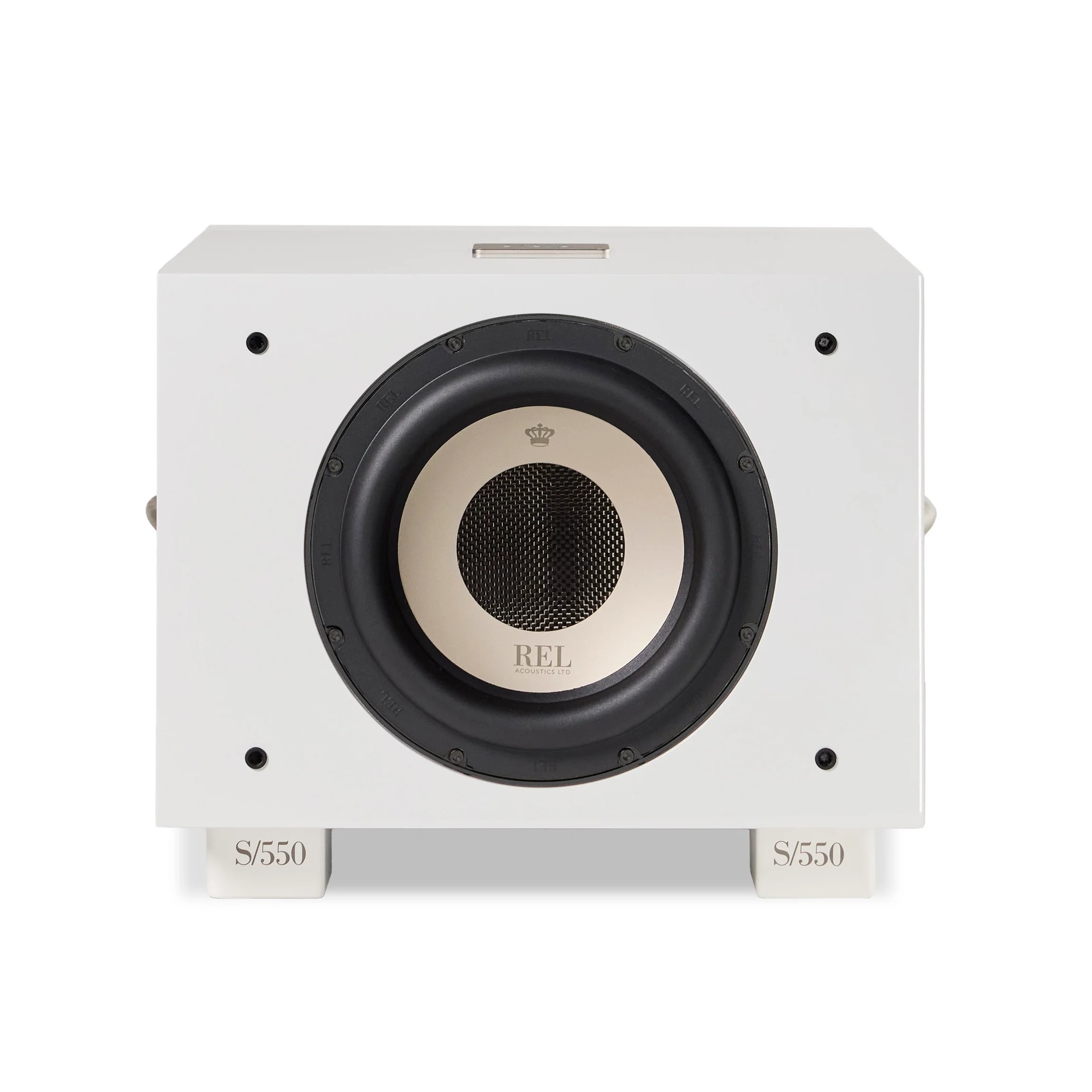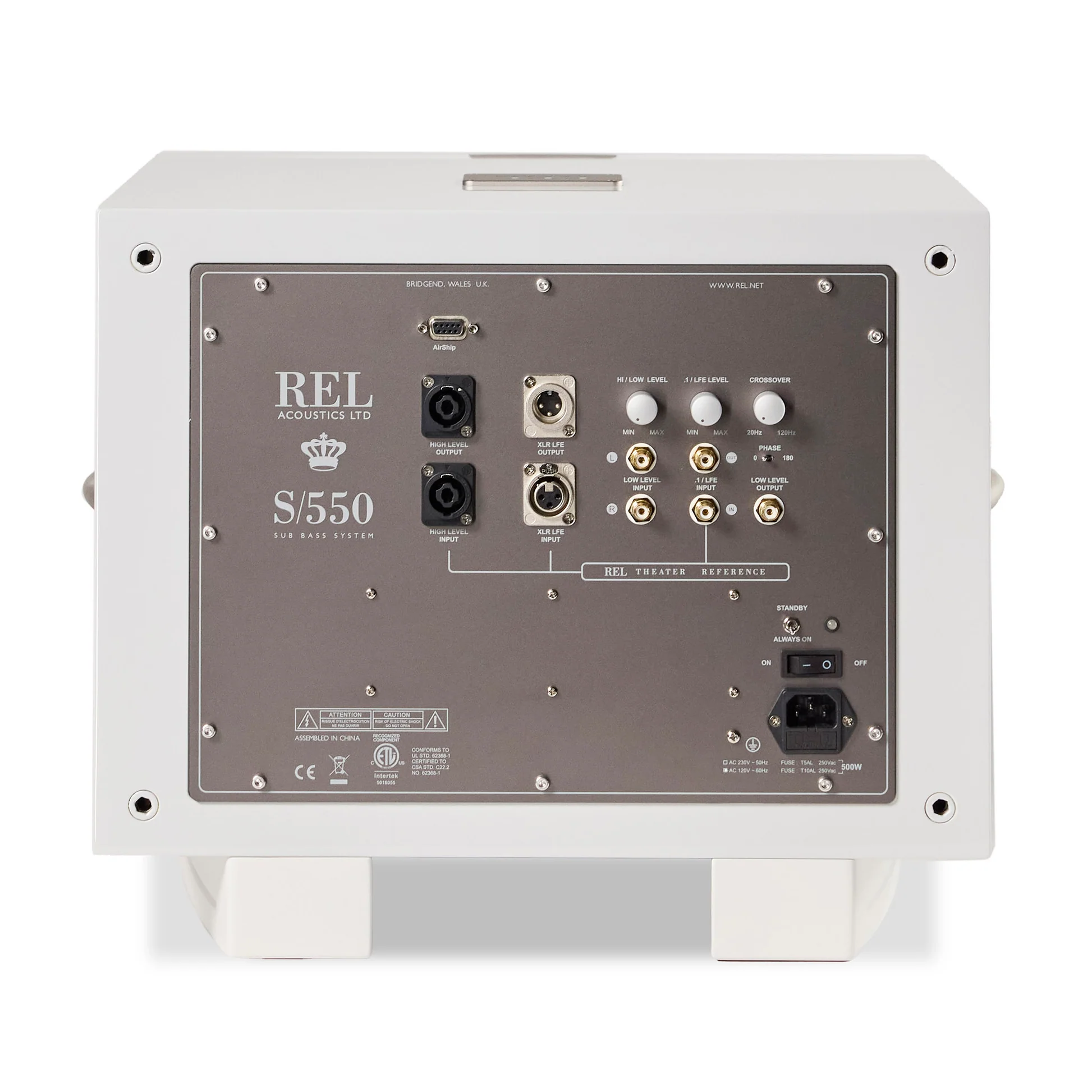 Το REL S/550 ειναι ενεργο υπογουφερ με 1x 10" woofer και 1x 12" passive radiator, με ενσωματωμενο ενισχυτη 550wrms Pure Class D. Δυνατοτητα ασυρματης συνδεσης μεσω REL Airship Direct transmitter.