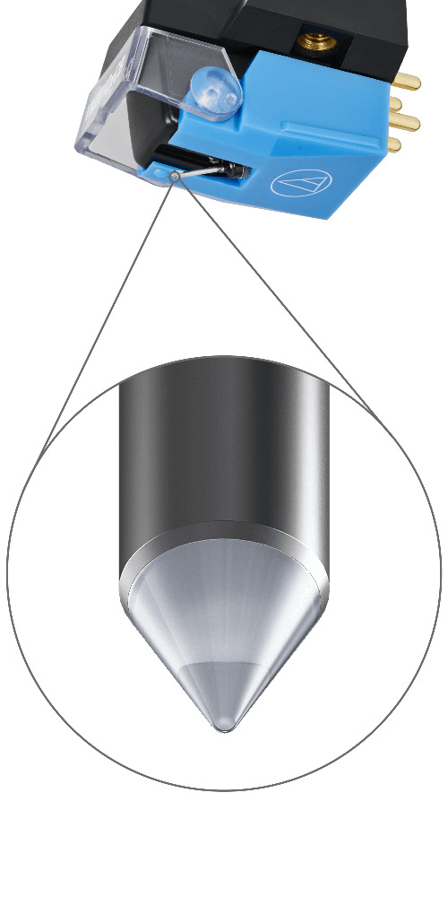 All VMx cartridges feature a generator with paratoroidal coil construction: two coils per channel – one stacked behind the other – for greatly improved efficiency. A center shield plate separates the left and right channels to reduce crosstalk and maintain a clear stereo image. The copper wire used for the coils has been upgraded to PCUHD® (Pure Copper Ultra High Drawability), resulting in richer, more nuanced audio reproduction. The number of coil turns has also been slightly reduced to improve transient response, allowing the cartridge to react more quickly to signal changes for stunningly clean music with lifelike immediacy. The 0.6 mil conical bonded stylus of the AT-VM510xCB tracks the center of the record groove for reliable performance and durability.