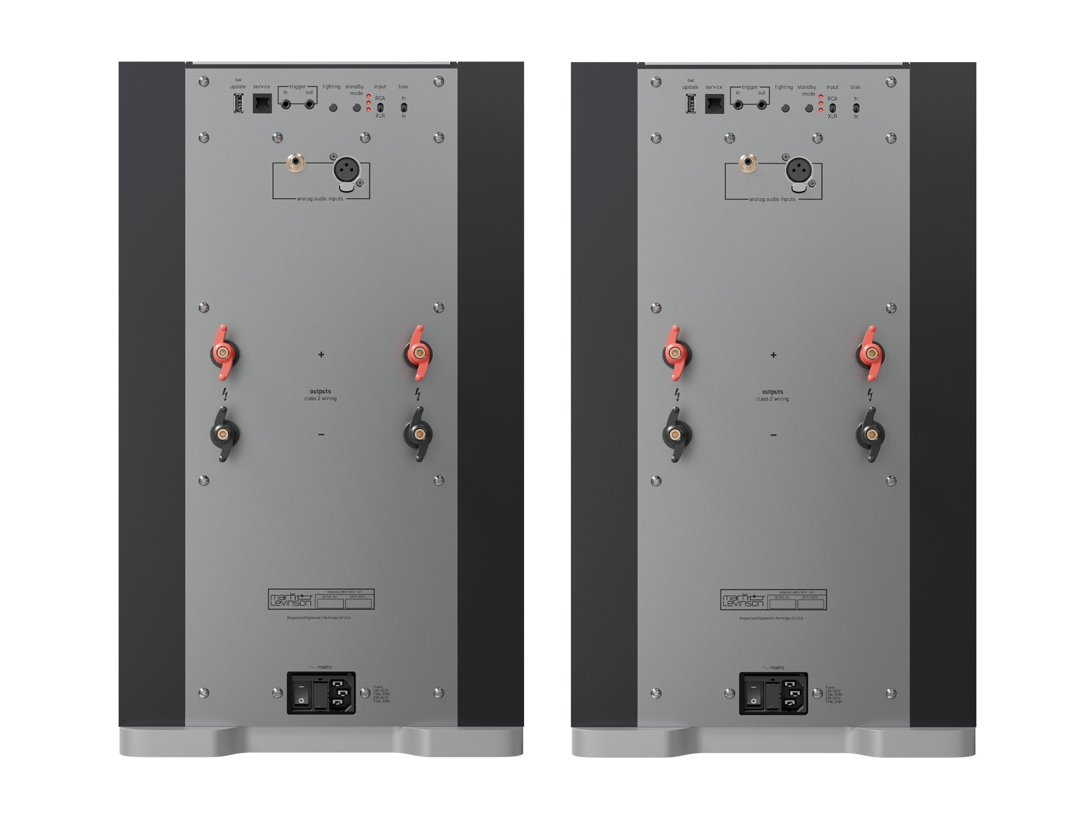 • Input & Output Connectors: One balanced XLR input; one single-ended RCA input; two pairs of “Mark Levinson Hurricane” loudspeaker output binding posts.