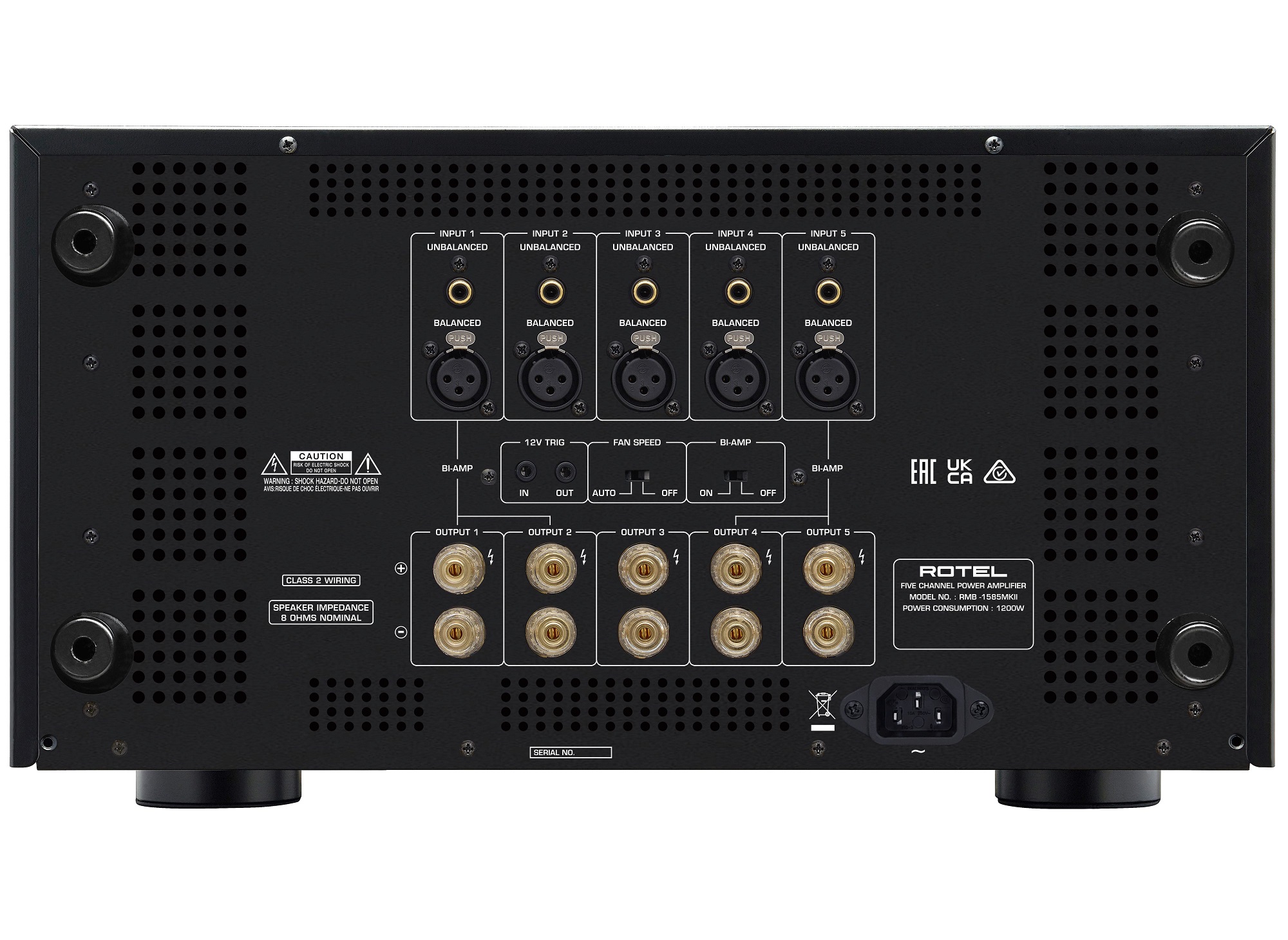 The RMB-1585MKII delivers unparalleled performance with 5-channels of Rotel Class AB amplification rated at 210 Watts per channel into 8 ohms and an impressive 340 Watts per channel into 4 ohms with all channels driven.