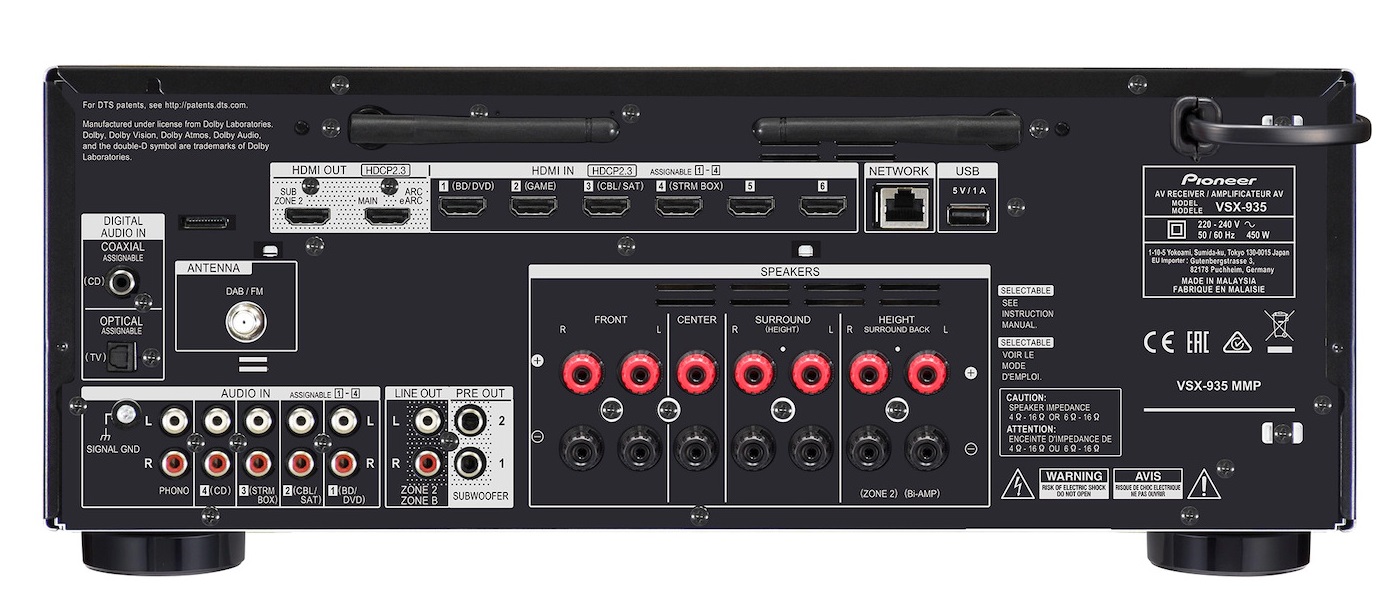 Ο Pioneer VSX-935 ειναι home cinema ραδιοενισχυτης 7.2 καναλιων, ισχυος 7x135w 6 ohms. Διαθετει: Internet Radio, FM, AM, DAB, DAB+. Ενσυρματη συνδεσιμοτητα εικονας 6x HDMI In, 2x HDMI Out. Ασυρματη διασυνδεσιμοτητα με WiFi, Bluetooth. Υποστηριζομενοι Codecs εικονας: HDR, HDR 10, Dolby Vision, HLG. Streamer services: Amazon Music, Spotify, Tidal, Deezer, TuneIn.